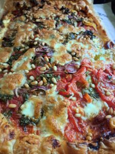 Quand on croule sous les tomates, après les salades, les sauces, les galettes, les bocaux pour l’hiver: les tartes!! Et celle-ci est un mix de différentes recettes glanées ça et là. Et il faut dire qu’elle fait son effet (même auprès de ceux qui n’aime que la viande…sisi!!). Pleine de saveurs, elle peut être servie comme plat (accompagnée d’une petite salade) mais elle peut aussi se partager en apéro (elle se tient bien même avec des tomates très aqueuses).