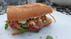 Il existe autant de recettes de Bánh mì que de familles mais il y a des éléments incontournables : la mayonnaise maison (à l’ail souvent), les légumes marinés et la coriandre fraîche. La tribu triche un peu avec une version avec du sriracha et surtout un porc mariné de la flemme (mélange tout fait). Mais le résultat est top!